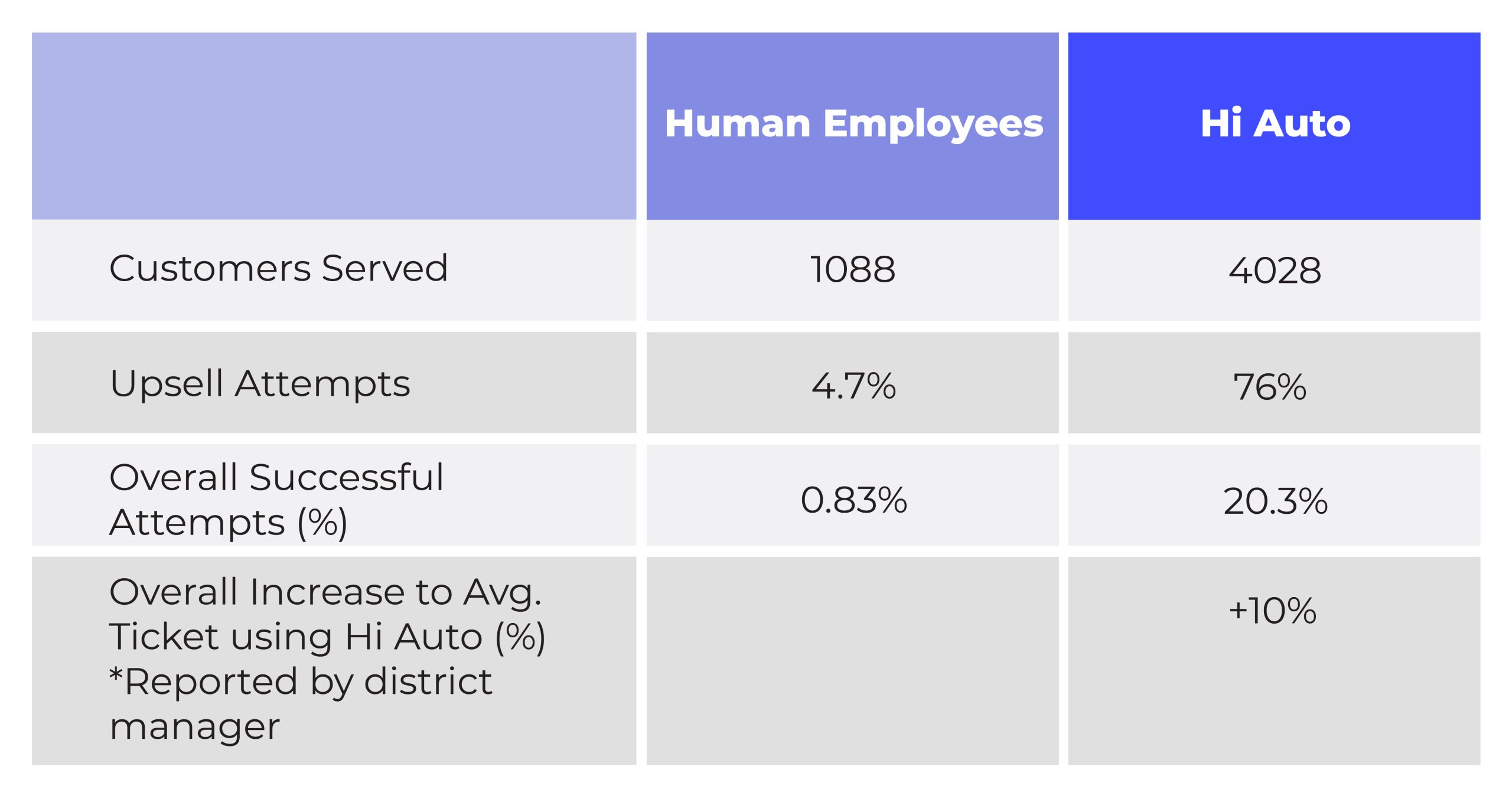 Over the course of the experiment, the employees took 1088 orders, while Hi Auto’s AI tool handled a little over 4,000. Results of the experiment weighed heavily in Hi Auto’s favor. Employees attempted 52 upsells, converting just 9 successful sales. In contrast, Hi Auto attempted upsells 76% of the time, resulting in an overall average ticket increase of 10%.